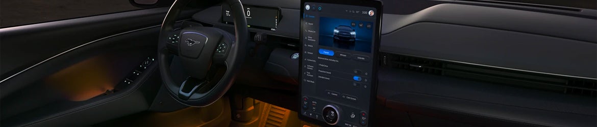 The 2023 Ford Mustang Mach-E interior embraces modernity with premium materials, radiating a plush ambiance. Designed for family and fun, it accommodates up to five passengers comfortably. The generous rear cargo space extends further when the rear seats are folded down, offering ample room for luggage and gear.